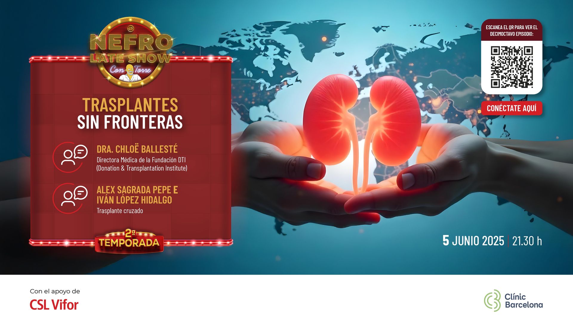 Parlarà sobre com, el nostre país, ha aconseguit ajudar a la implantació i millora de programes de trasplantament en el món. Per fer-ho, comptarà amb la Directora Mèdica de la Fundació DTI (Donation&Transplantation Institut), la Dra. Chloë Ballesté. També sobre l'experiència d’un trasplantament renal creuat, amb l'Àlex Sagrada Pepe i l'Iván López Hidalgo, receptor i donant, respectivament.