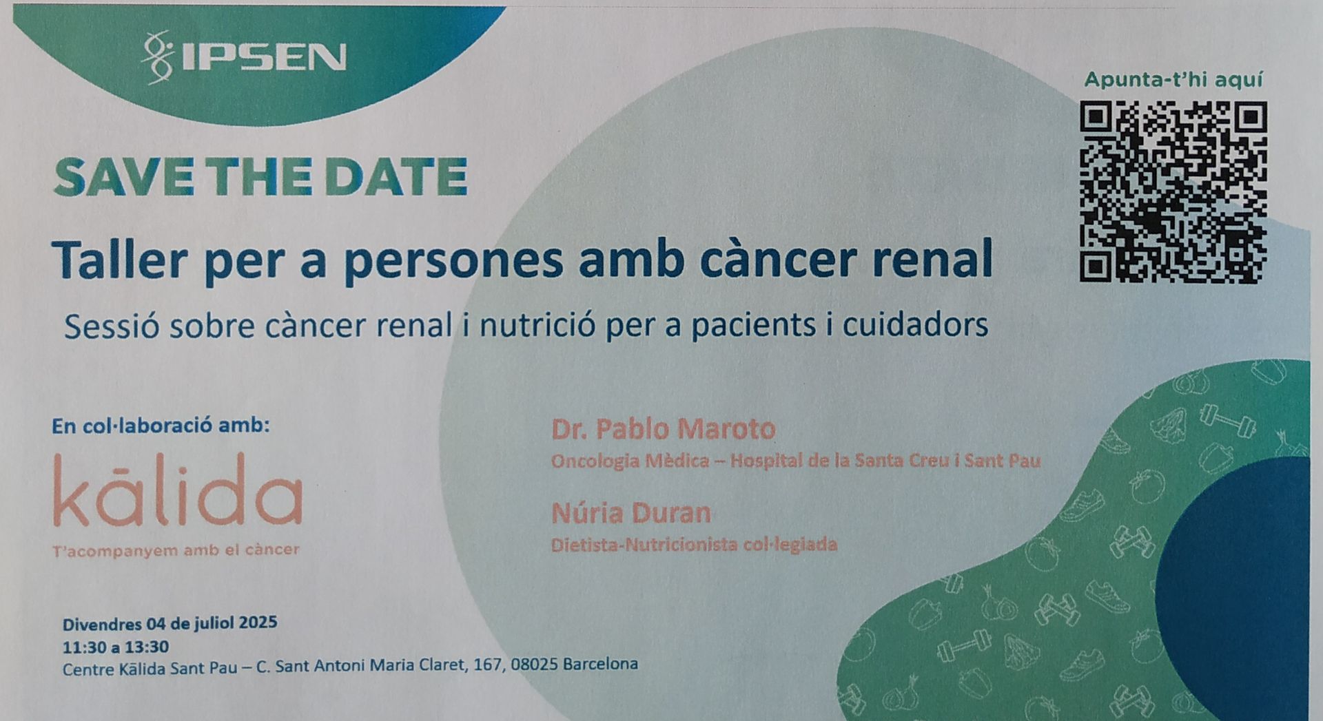 El pròxim divendres, 4 de juliol de 11.30h a 13.30h la fundació Kalida Sant Pau, farà una xerrada per a persones amb càncer renal i els seus cuidadors amb el Dr. Pablo Maroto del Servei d'Oncologia Mèdica de l'Hospital de Sant Pau, expert en càncers i tumors urològics, i la dietista-nutricionista de Kalida, Núria Duran. Kālida Sant Pau és un espai obert i totalment gratuït per a totes les persones que conviiuen amb el càncer, independentment de l'hospital en que es tractin.